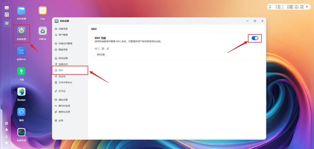 进入飞牛Nas的系统设置,来到SSH项,将SSH功能设置为启用: