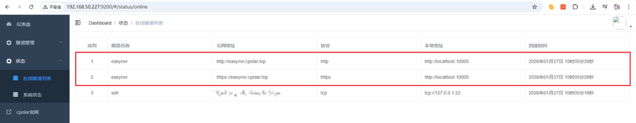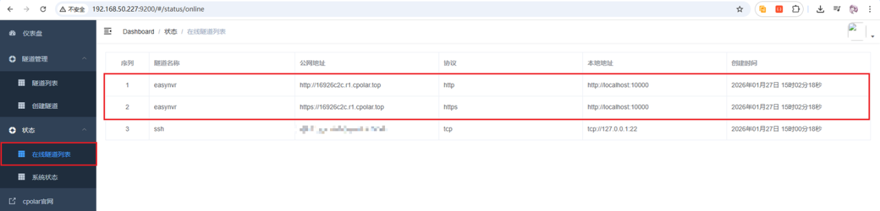 接着来到状态菜单下的在线隧道列表可以看到隧道名称为easynvr的公网地址已经变更为二级子域名+固定域名主体及后缀的形式了: