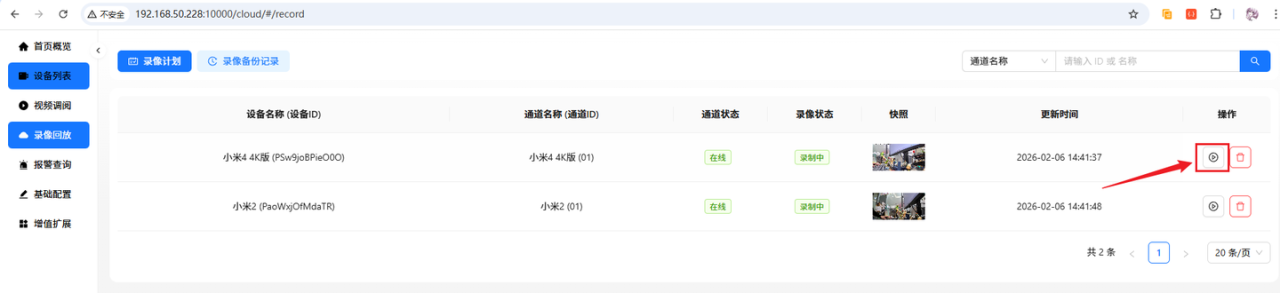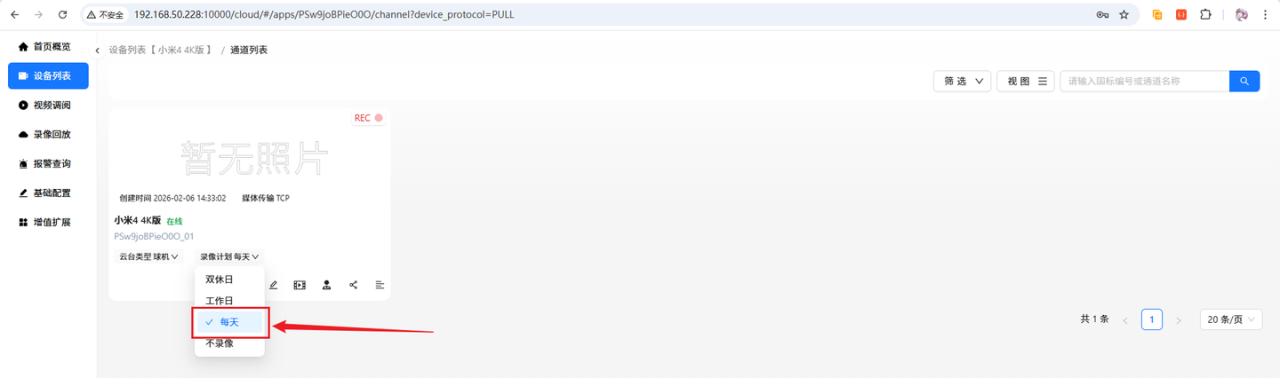 点击播放图标,点击进入,然后可以看到录像计划显示为未录像,这里直接将其设置为,这样就会一直录制啦: