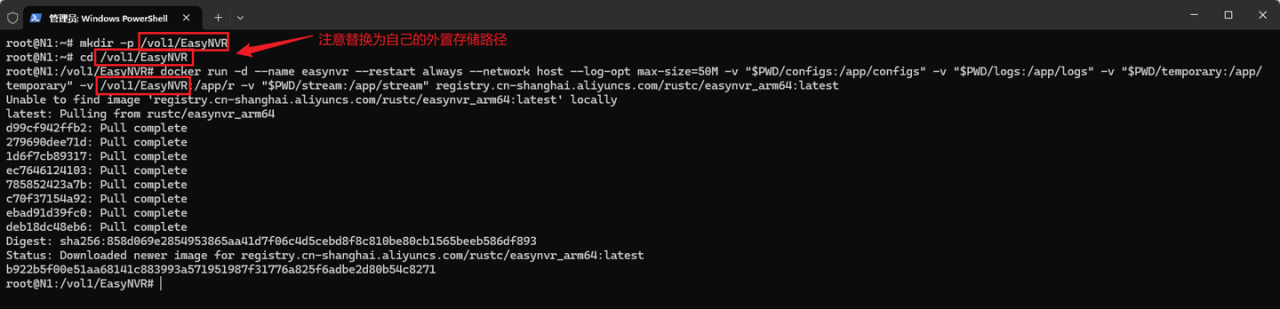 然后进行一键部署EasyNVR(注意替换存储路径):