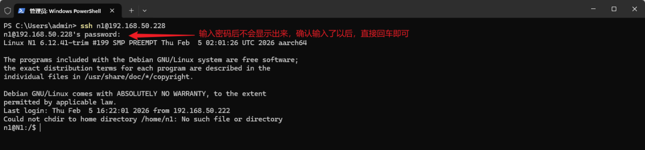 接着,输入如下命令连接你的飞牛NAS(也可以使用其他ssh工具):