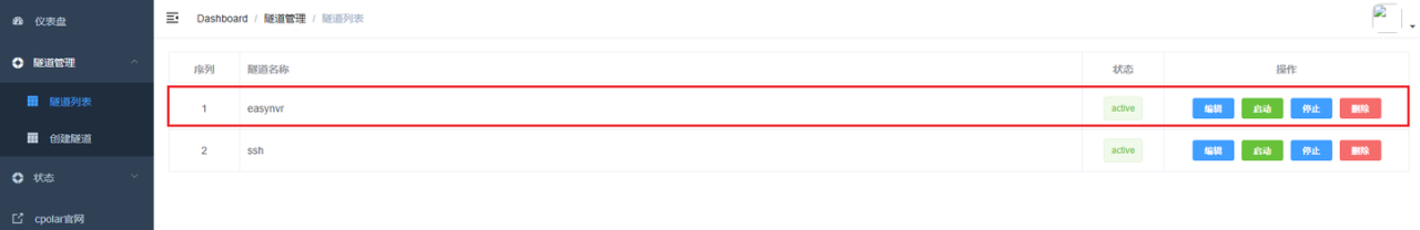 接着,进入侧边菜单栏的隧道管理下的隧道列表,可以看到名为easynvr的隧道: