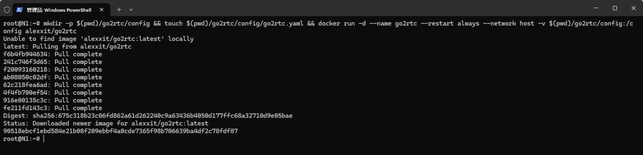 命令会进行创建/go2rtc/config目录和创建go2rtc.yaml配置文件,并且执行Docker一键部署命令,如下图:
