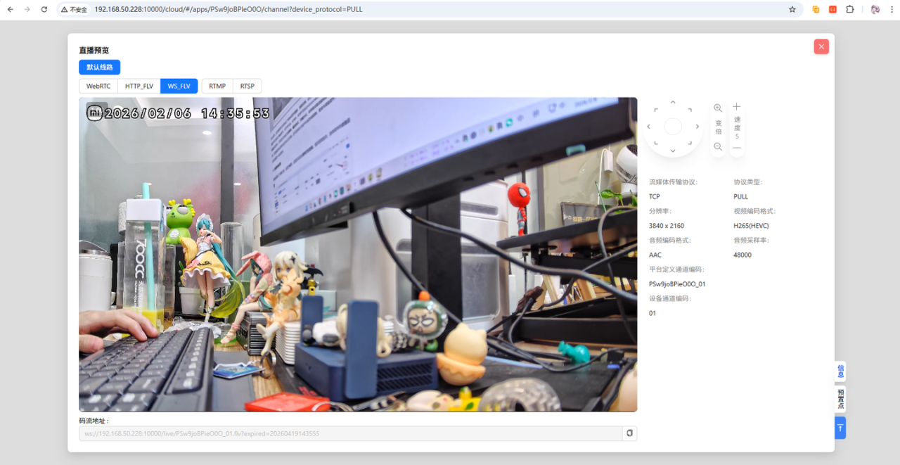 可以看到,该直播预览页面集成了多协议实时播放、线路切换、云台控制与参数可视化等能力,用户可根据实际场景在 WebRTC、HTTP-FLV、RTMP、RTSP 等协议间自由切换以兼顾延迟与兼容性;在视频播放的同时,页面还实时展示分辨率、编码格式、传输方式、码率等关键流媒体信息,便于调试与排障;若视频流协议源本身支持云台控制,还可直接在页面中完成方向控制、变倍与速度调节,实现从预览到运维的一体化操作。