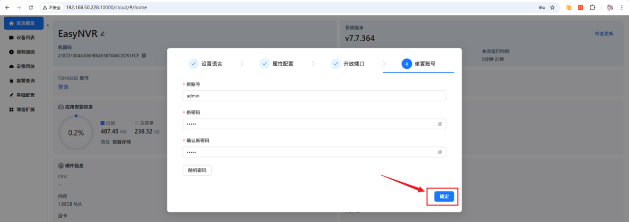 在重置账号页面,创建一个新的管理员账户,点击确定: