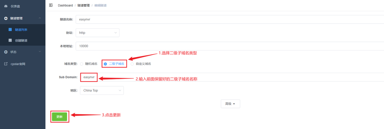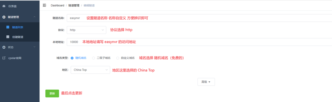点击编辑website的隧道,这里设置名称为easynvr方便辨识,然后本地地址填写10000端口系统的访问地址,地区这里选择的China Top,然后点击更新: