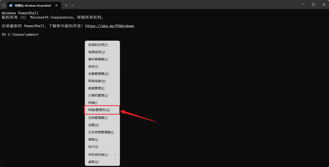设置好以后,接着电脑上摁Win + X键,选择终端(管理员),打开PowerShell窗口(cmd命令提示符窗口也可以的):