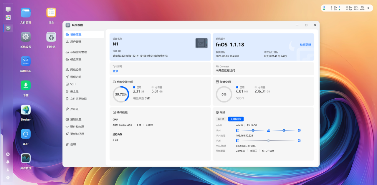 如果同样有想刷入arm版飞牛Nas的小伙伴可以先移步这篇:7年矿渣重生!N1盒子刷入ARM版飞牛NAS!(保姆级教程) 文章。目前N1的arm版飞牛固件已支持无线网卡驱动,可以通过连接WiFI的方式来进行联网。可以刷入453版固件,然后进行OTA升级至当前最新1.1.18系统版本即可。