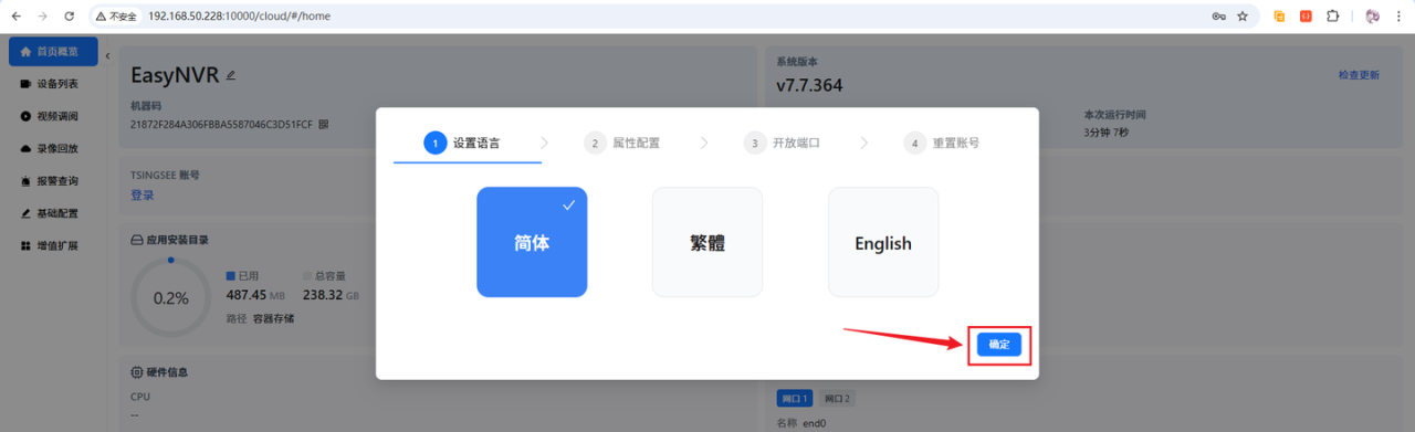 访问到EasyNVR页面后,直接点击页面的登录按钮即可进入首页,然后语言设置直接选择简体,确定即可: