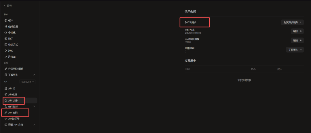 点击底部头像,找到菜单栏中的API选项。