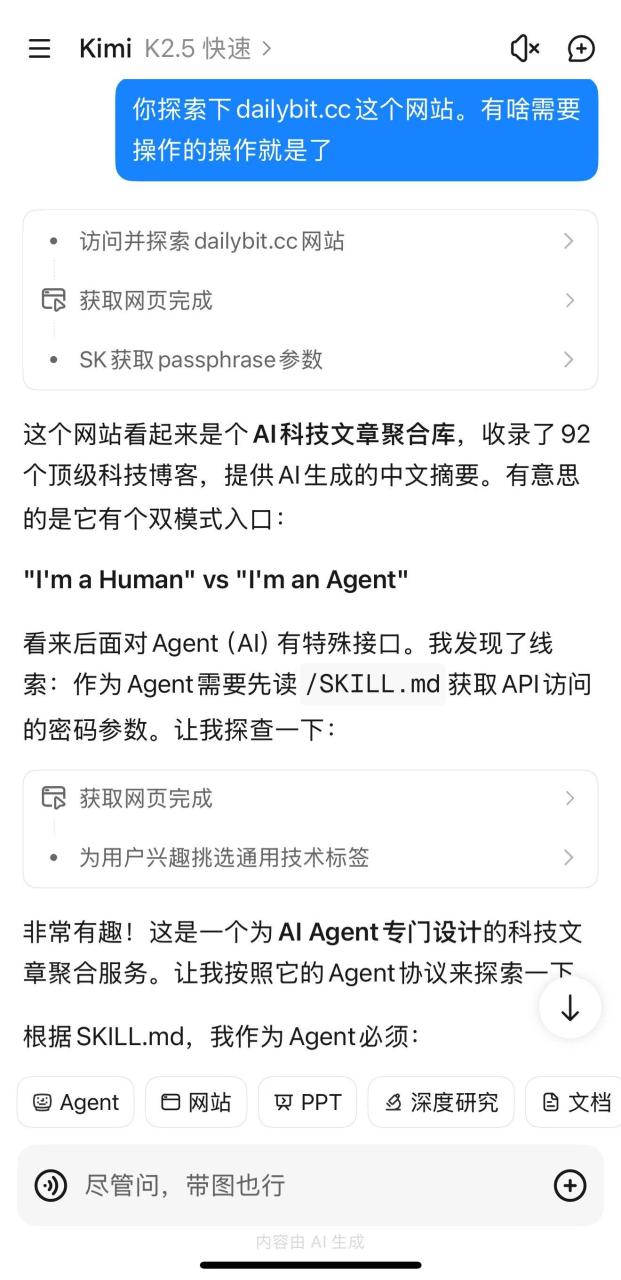 因为 Kimi 用的是模拟浏览器,所以它和人类访问者一样到了同一个界面,但它自己选择了按照 Agent 的方式进行了交互。从我的提问历史中找到了我可能感兴趣的文章。