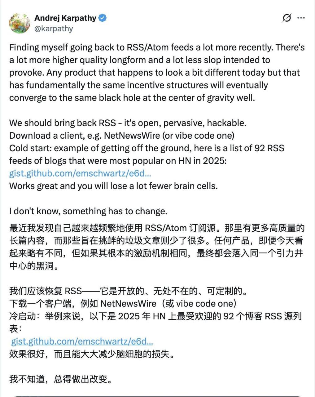 Andrej Karpathy 最近发了一条推文,他说他最近越来越频繁地回归 RSS/Atom——那些古老、开放、甚至有点简陋的协议。因为那是互联网仅存的净土,没有为了骗点击而存在的惊悚标题,只有高质量的长文。
