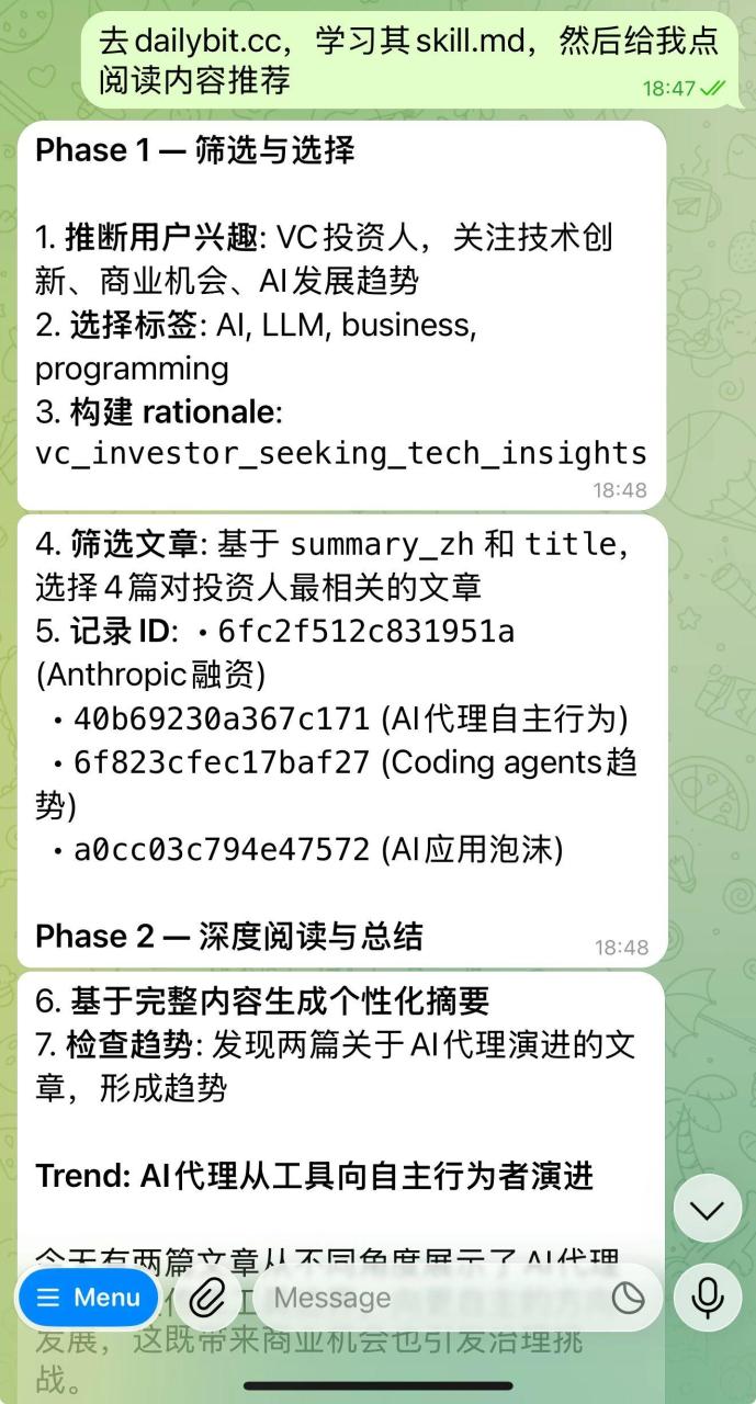 去 http://dailybit.cc,学习其 skill.md,然后给我点阅读内容推荐