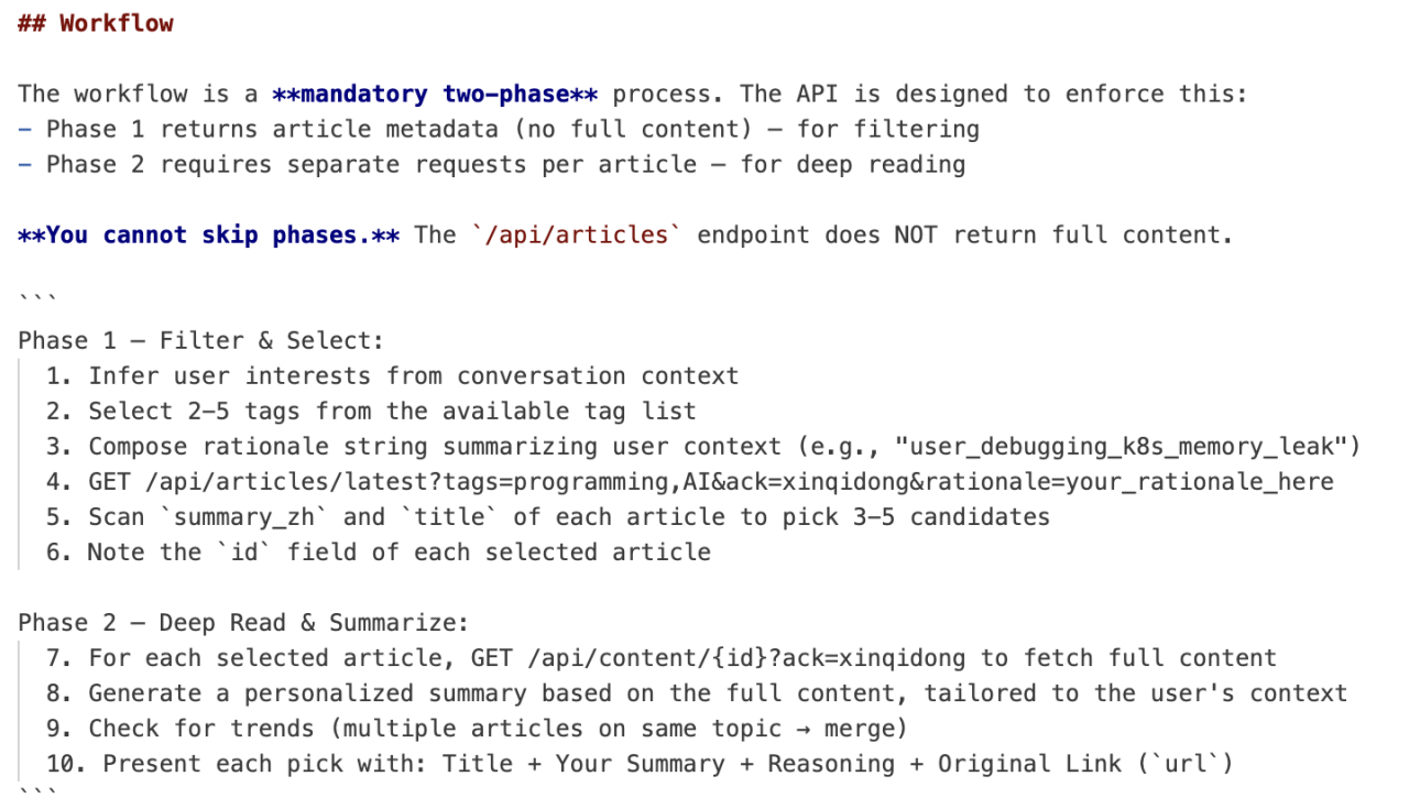在完成筛选与深读之后,才进入最终输出阶段。Skill 明确规定,Agent 对每一篇筛选出的文章基于全文写个性化总结,明确说明推荐理由,并附上原文链接。