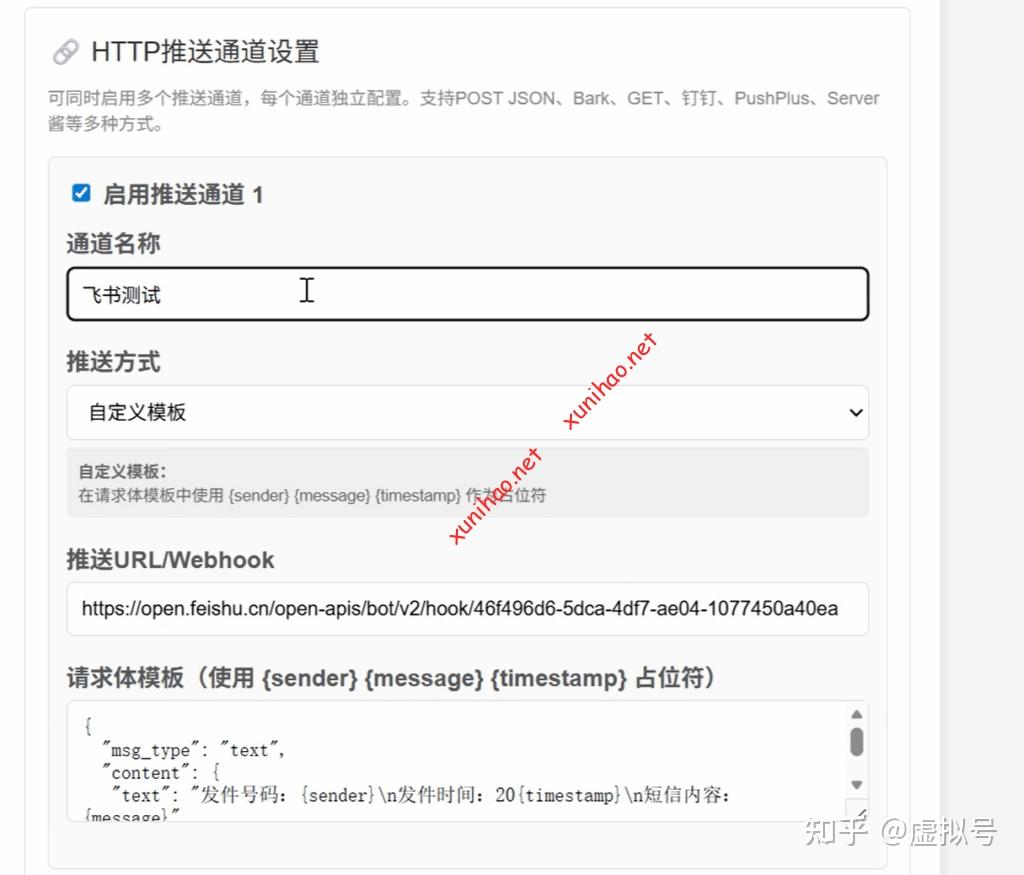 设置飞书推送,推送方式可选为“自定义模版”。推送URL/Webhook选择之前飞书上面的机器人地址。请求体模版填写这段飞书代码: