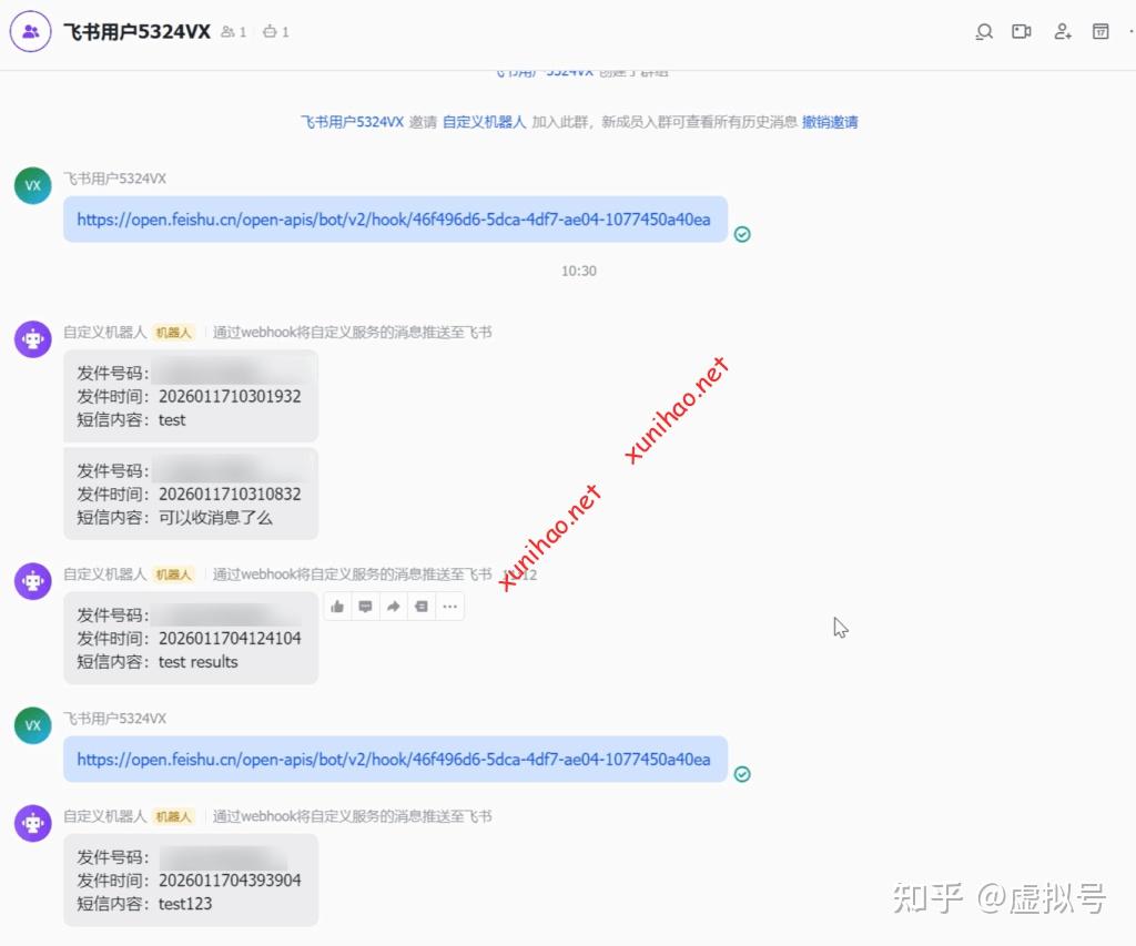 现在发送短信到SIM卡号的手机号,测试的短信会立马显示到飞书上。
