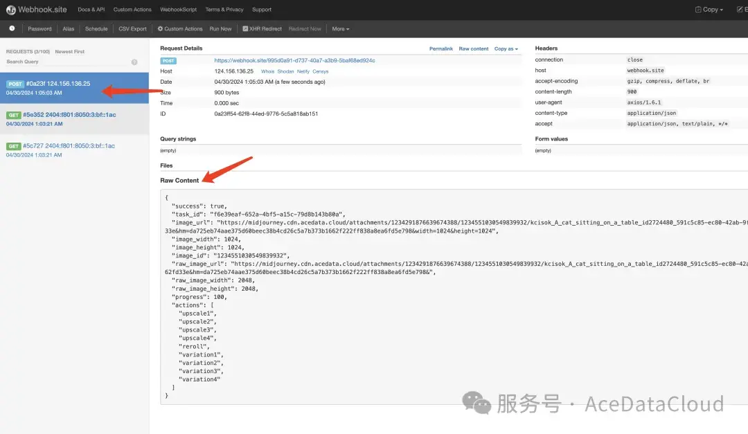 稍等片刻,等图片生成结束,可以发发现 Webhook URL 收到了一个 HTTP 请求,如图所示: