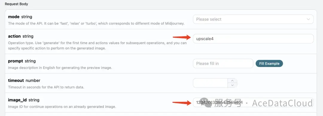 这时候我们可以挑选其中一张进行精细化地放大操作,比如选第四张,那就可以 action 传入 upscale4,通过 image_id 再次传入当前图像的 ID 即可。