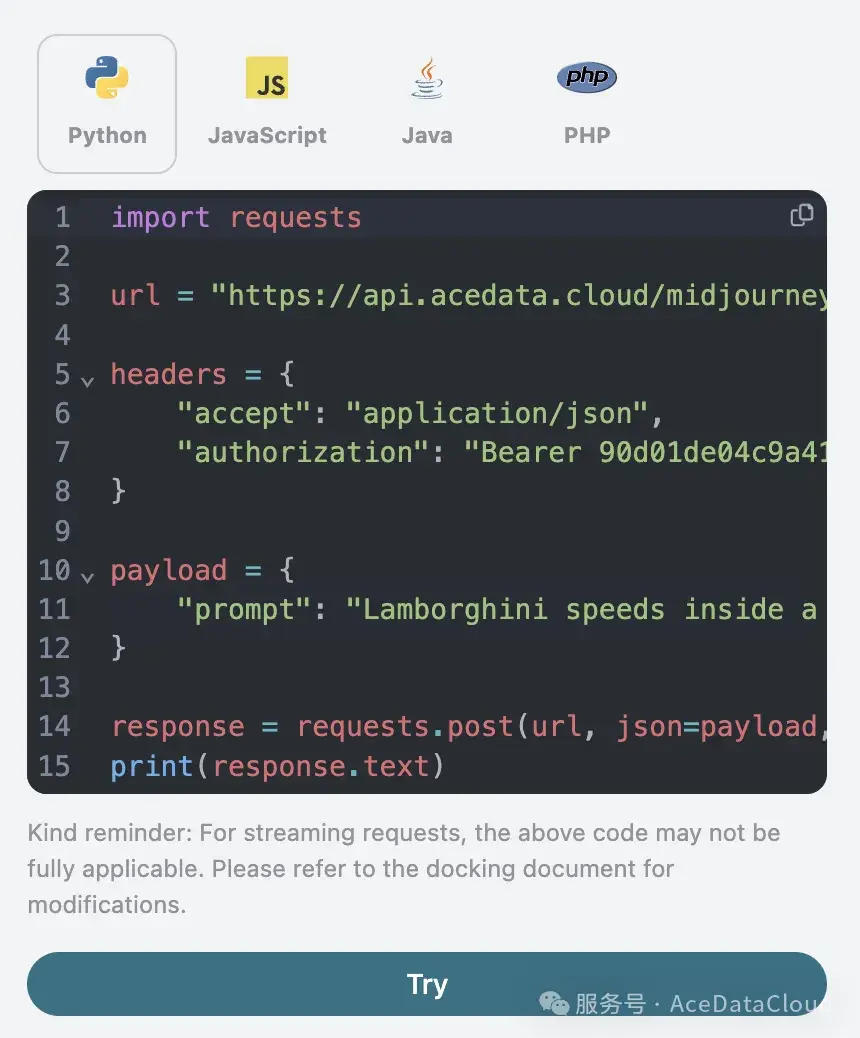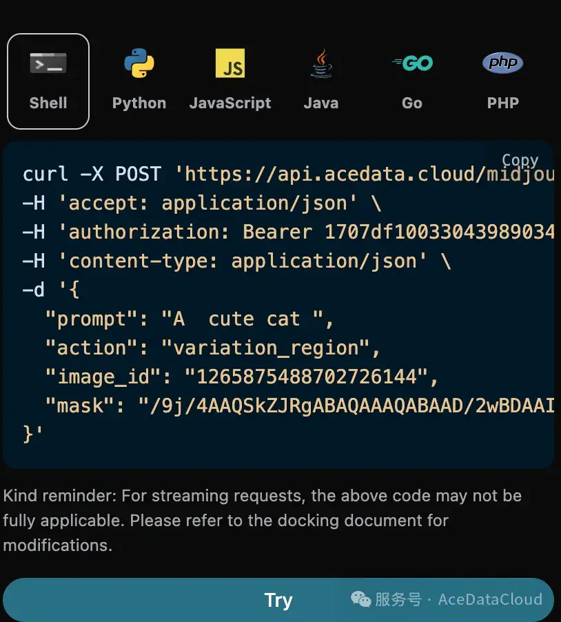 同时您可以注意到右侧有对应的调用代码生成,您可以复制代码直接运行,也可以直接点击「Try」按钮进行测试。