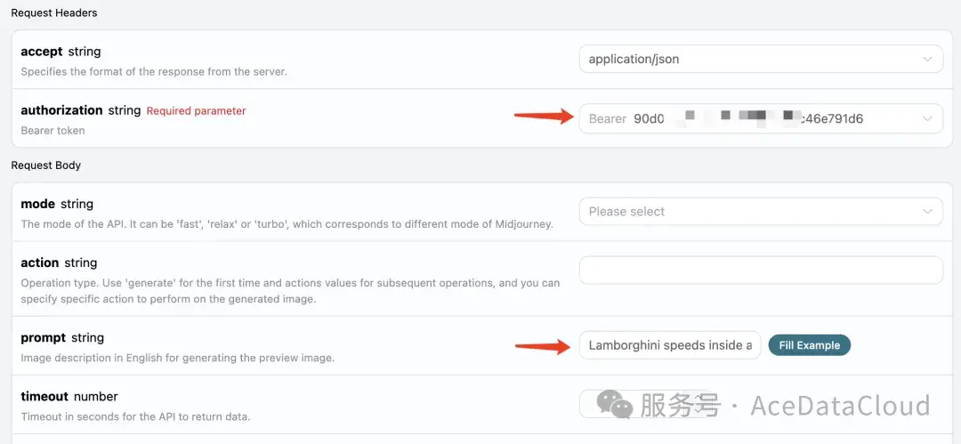 在第一次使用该接口时,我们至少需要填写两个内容,一个是 authorization,直接在下拉列表里面选择即可。另一个参数是 prompt, prompt 就是我们想生成的图片描述内容,建议用英文描述,画的图会更准确效果更好,这里我们用了示例内容 Lamborghini speeds inside a volcano,代表要画一个兰博基尼在火山飞驰。