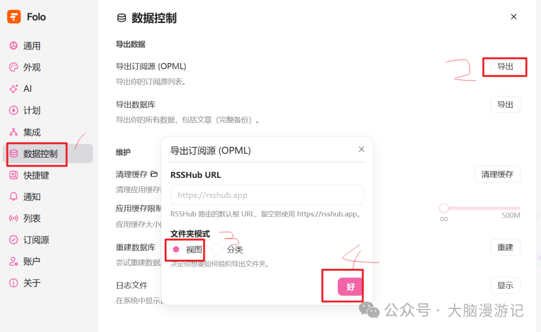 说明:「视图」:会导出文件夹树状结构。「分类」:会将所有订阅源打散,归入系统预设的“文章、视频、图片”等大类
