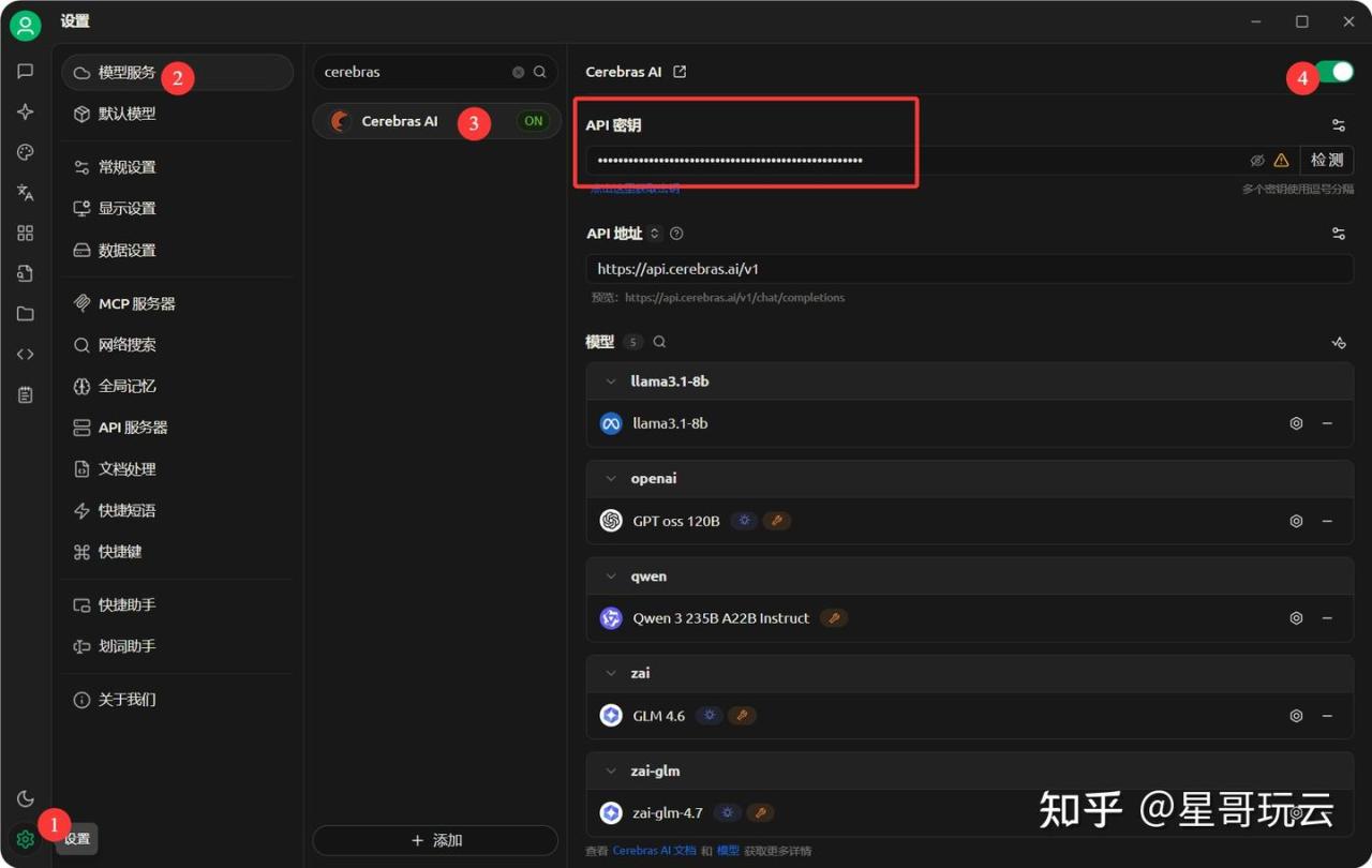 依次点击,设置、模型服务、搜索cerebras,填写api密钥