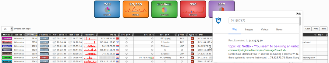 Web 界面做得还算清楚。上面有个时间轴,可以查看之前几天或几个月的威胁记录。