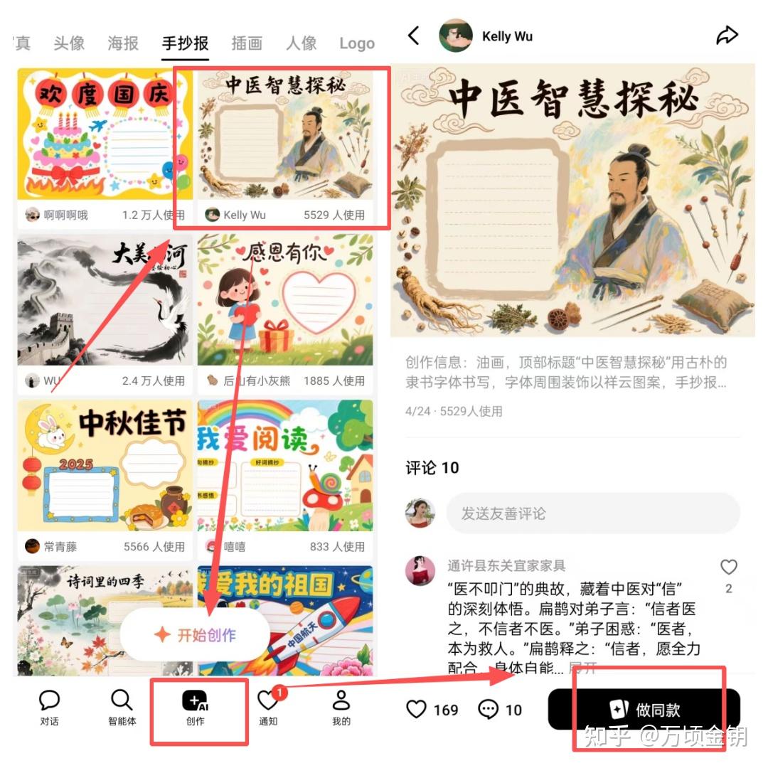 找模板:打开豆包app(没有的手机应用商城下一个就行),再点击底部的“AI创作”,选择“手抄报”,就能看到很多别人做好的作品。