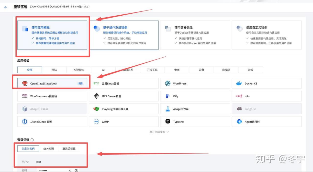 - 选择 Openclaw 模板: 在弹出的窗口中,选择“应用模板”,然后在众多模板中找到并选中“Openclaw”。勾选同意条款,并确认“无需备份,直接重装”。