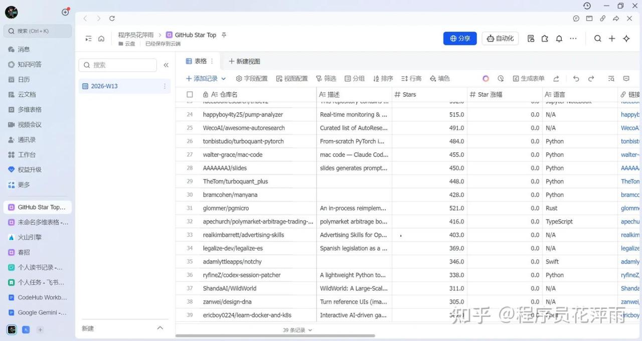 本周的热门 GitHub 仓库直达: https://my.feishu.cn/base/FB5wbrAOMaQoKqsQeuPcoOQXnx1?from=from_copylink