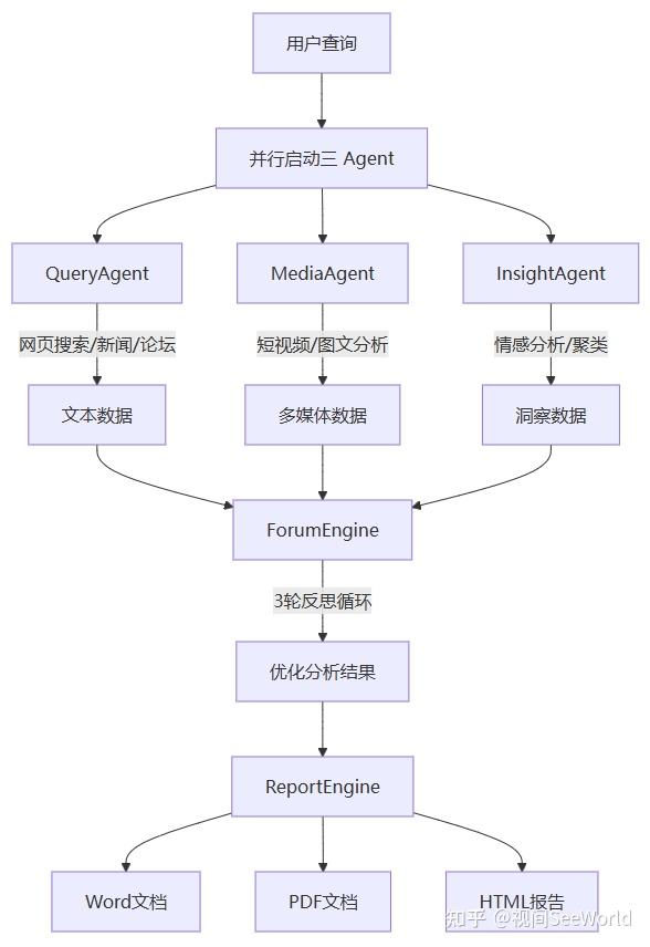 三引擎不是孤立工作的,它们通过 ForumEngine 实现协作讨论: