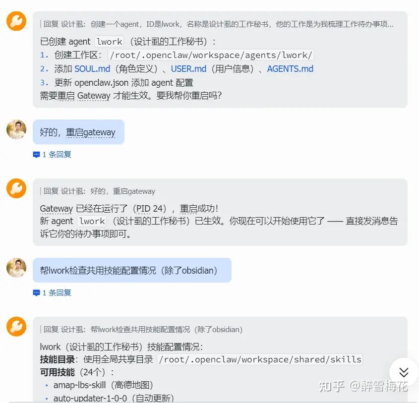 然后就等它创建完成就好了。新建 Agent 一般要重启 gateway,也让它帮你重启。建议创建完之后,检查一下有哪些技能需要配置,顺手配置好。