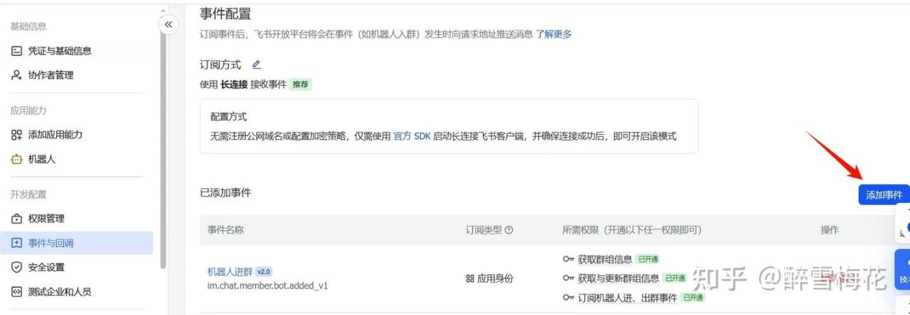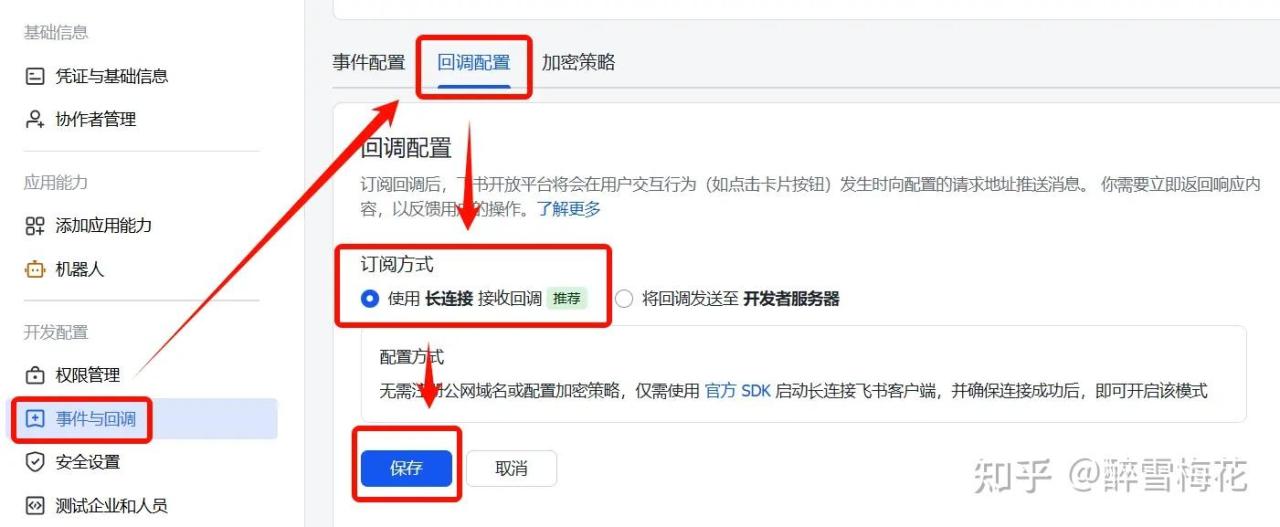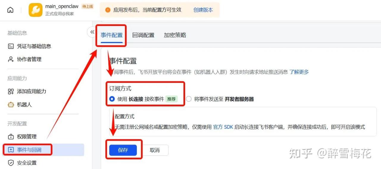在左栏“事件与回调”中,选择”事件配置”,订阅方式选择”使用长连接接收事件“,保存。