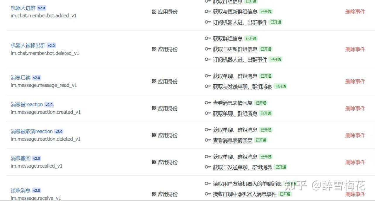在弹出的对话框中,找到下图几个事件,全打上勾。(你可以输入英文进行搜索,比如在搜索框输入 im. chat 就能找到机器人进群、机器人被踢出群,输入 im. message 就能找到剩下4个)