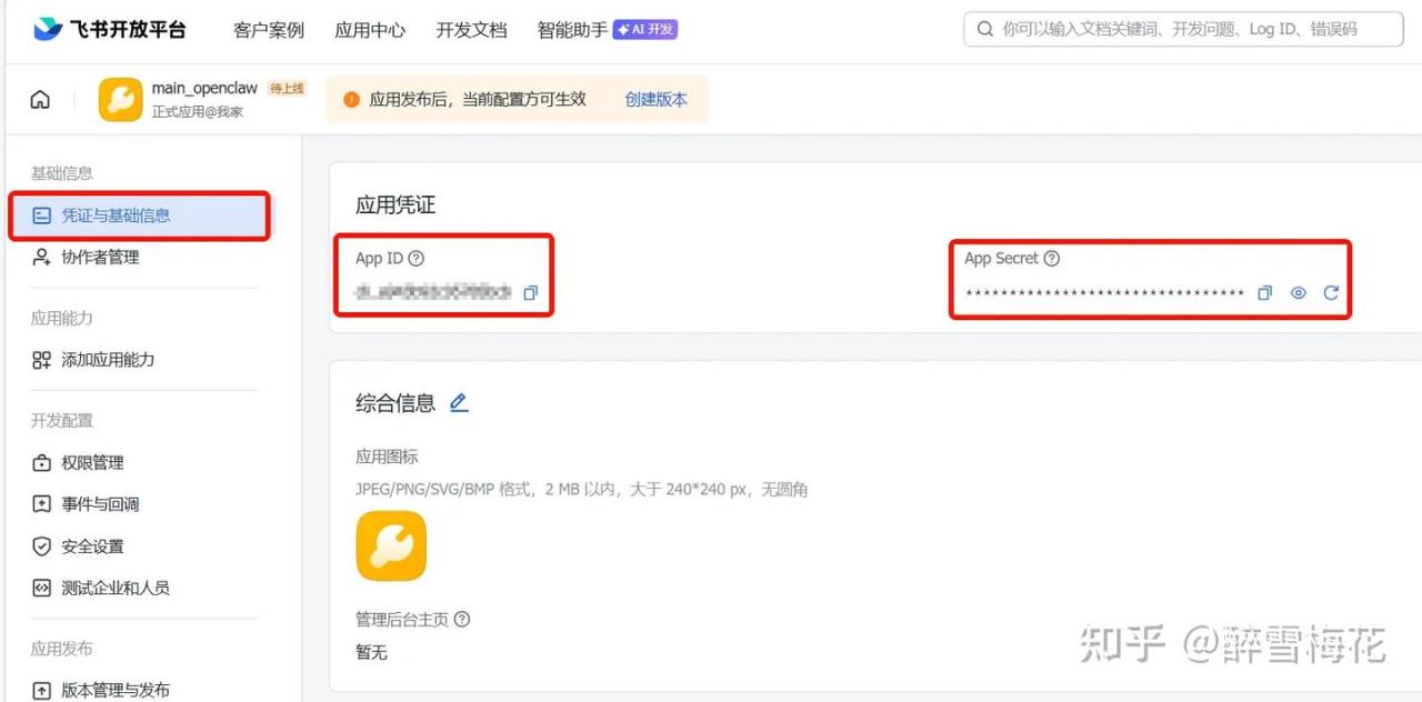 最后,在左边栏选择“凭证与基础信息”,把这个应用的 App ID 和 App Secret 复制下来,一会儿要用。