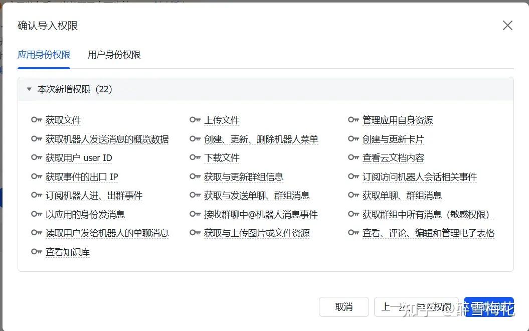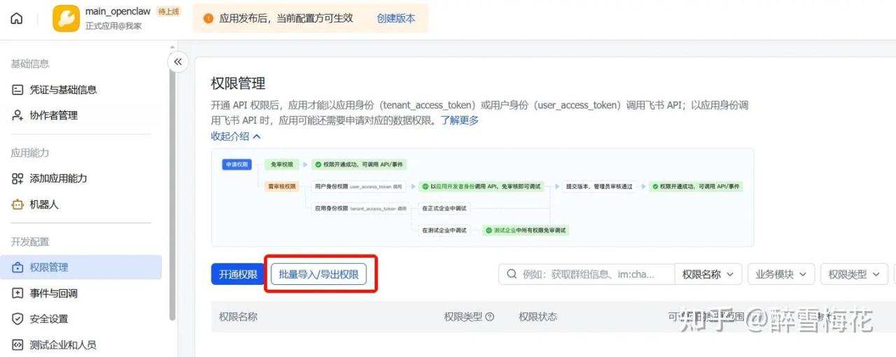 然后我们为机器人设置权限。这关系到你的龙虾能在飞书干什么。在左栏选择“权限管理”,点击“批量导入/导出权限”。