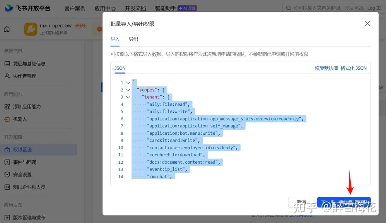 在弹出的对话框中,选择“导入”,我这提供几个基本的权限,直接复制粘贴进去,选择“下一步,确认新增权限”。