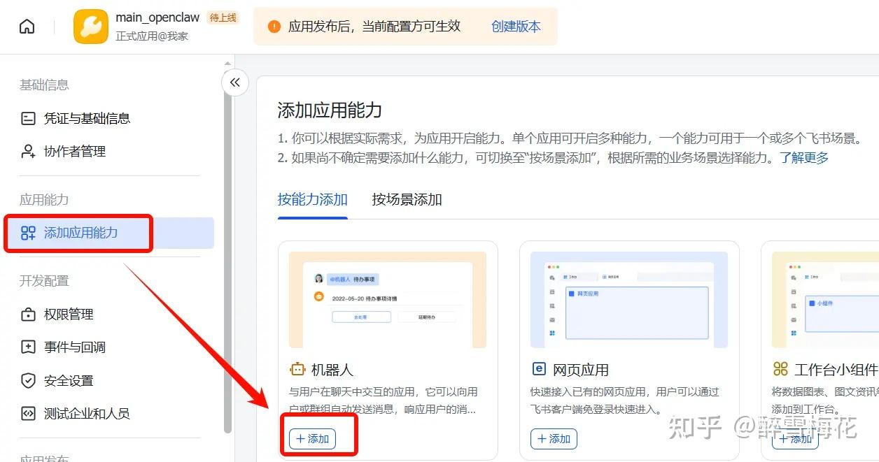 进来之后,在左边栏选择“添加应用能力”,找到“机器人”,点击“添加”。
