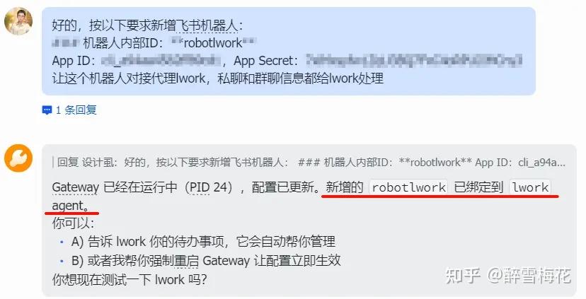 当它告诉你已经完成后,把两个飞书机器人的 App ID 和 App Secret 告诉它,并指定一下哪个机器人是连接到哪个 Agent 的,比如: