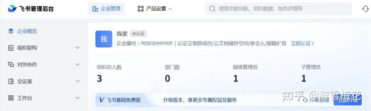 首先,我们要在飞书新建一个企业,随便建就行,比如我新建了一个名叫“我家”的企业。不用认证。如果还有其他人要用,可以把他们当员工拉进这个企业。