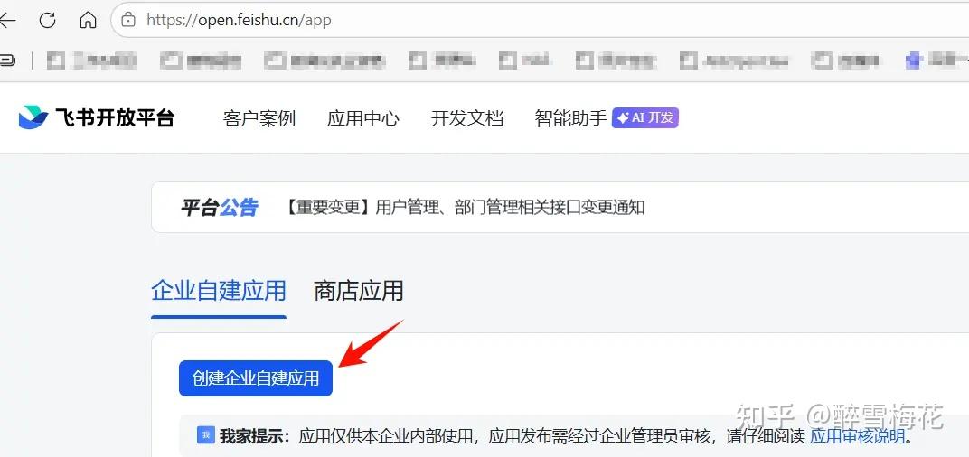 然后我们在飞书开放平台中,创建机器人来对接每个 Agent。我们在飞书开放平台的开发者后台,点击“创建企业自建应用”