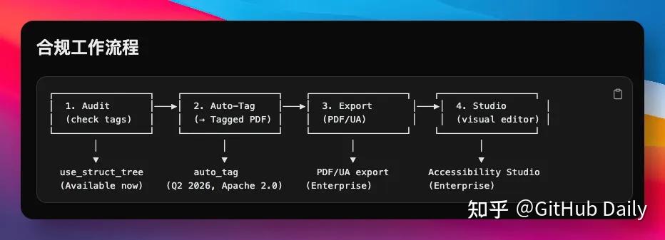 OpenDataLoader 的方案是:用同一套版面分析引擎,自动给无标签 PDF 生成结构标签,输出 Tagged PDF。