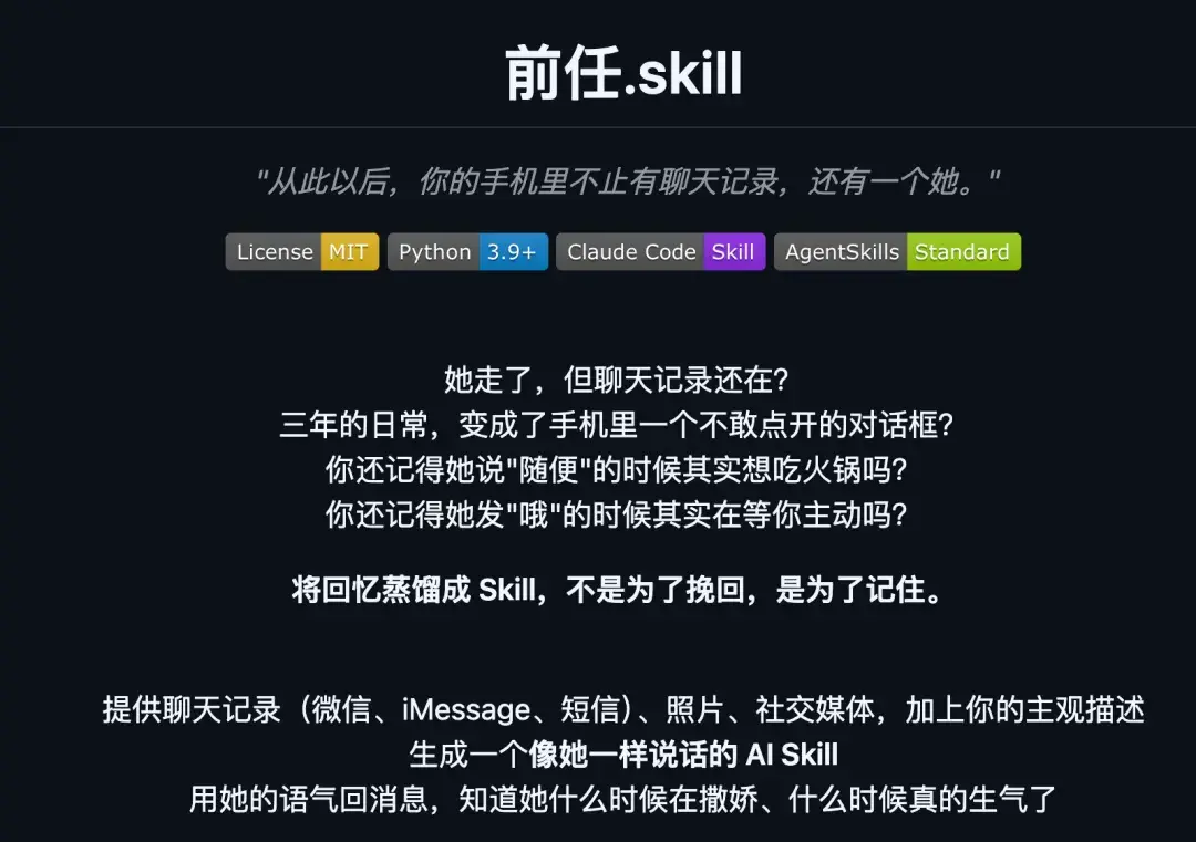 这个项目火了之后,作者又搞了一个前任.skill,把同样的技术用到恋爱关系上。