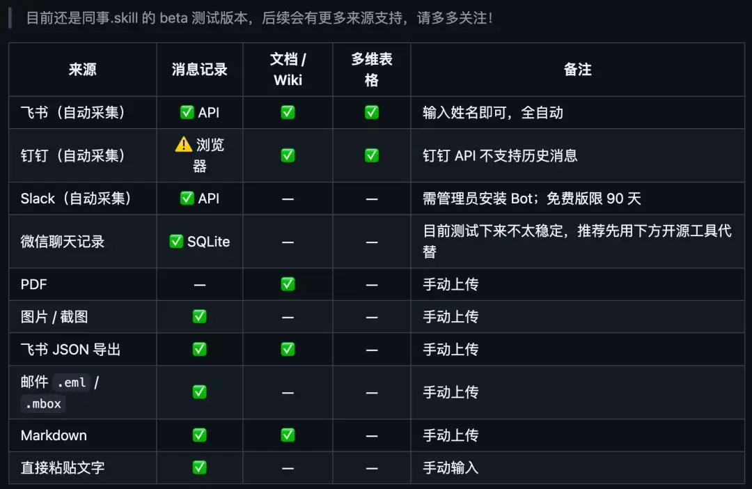 说白了就是把一个同事在各个平台上留下的痕迹全部扒下来,喂给 AI 去分析和学习。