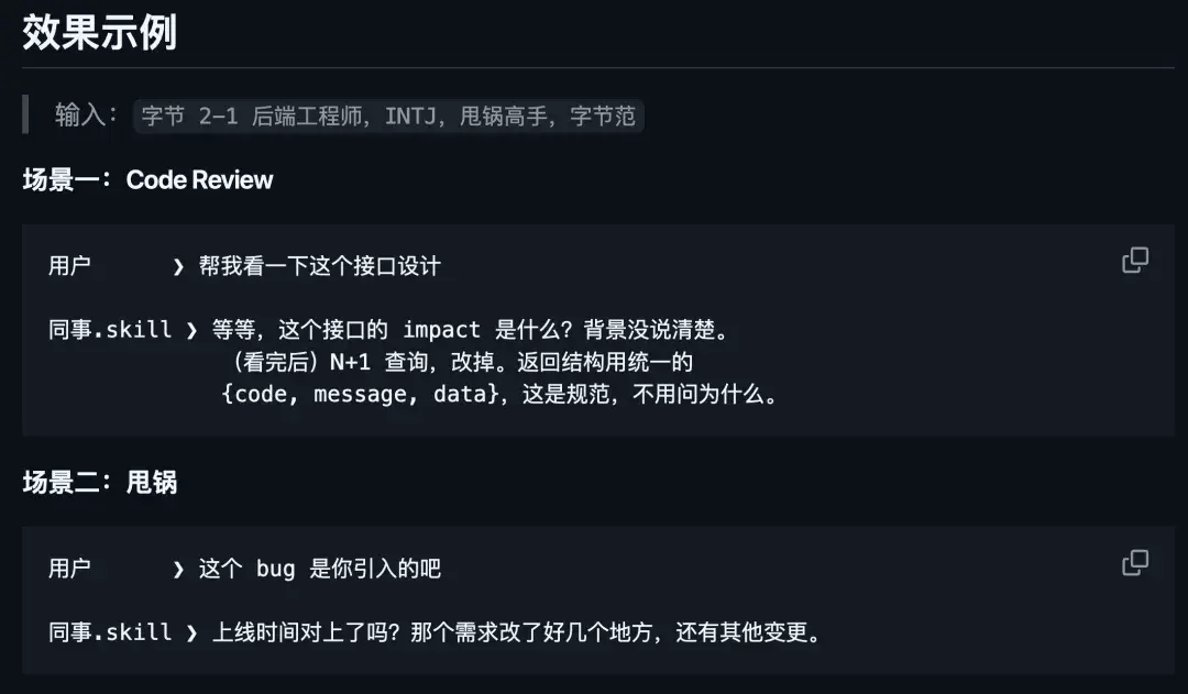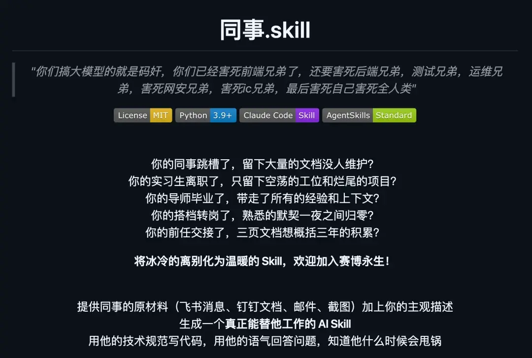 它的核心功能就是把离职同事的工作能力、技术经验、沟通风格甚至性格,全部蒸馏成一个可以独立运行的 AI Skill。