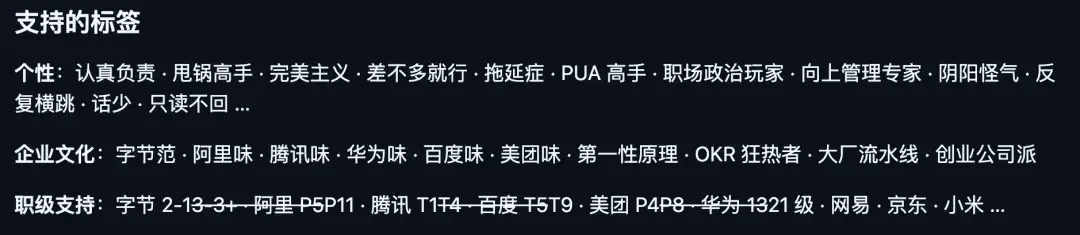 内置了各种人格标签:甩锅高手、PUA 高手、职场政治玩家、向上管理专家、阴阳怪气、话少、只读不回。