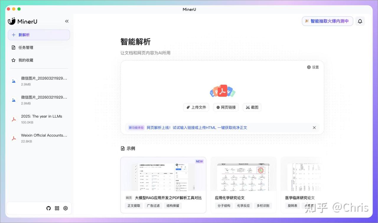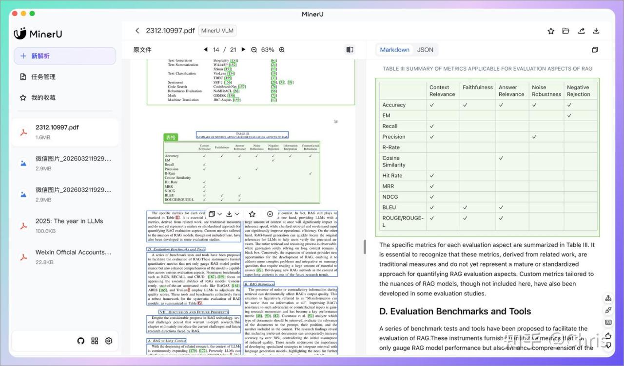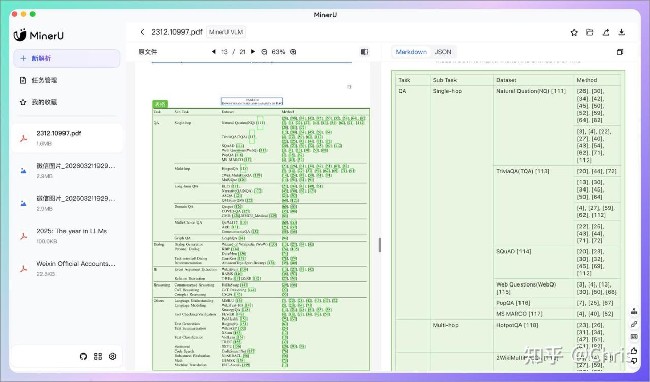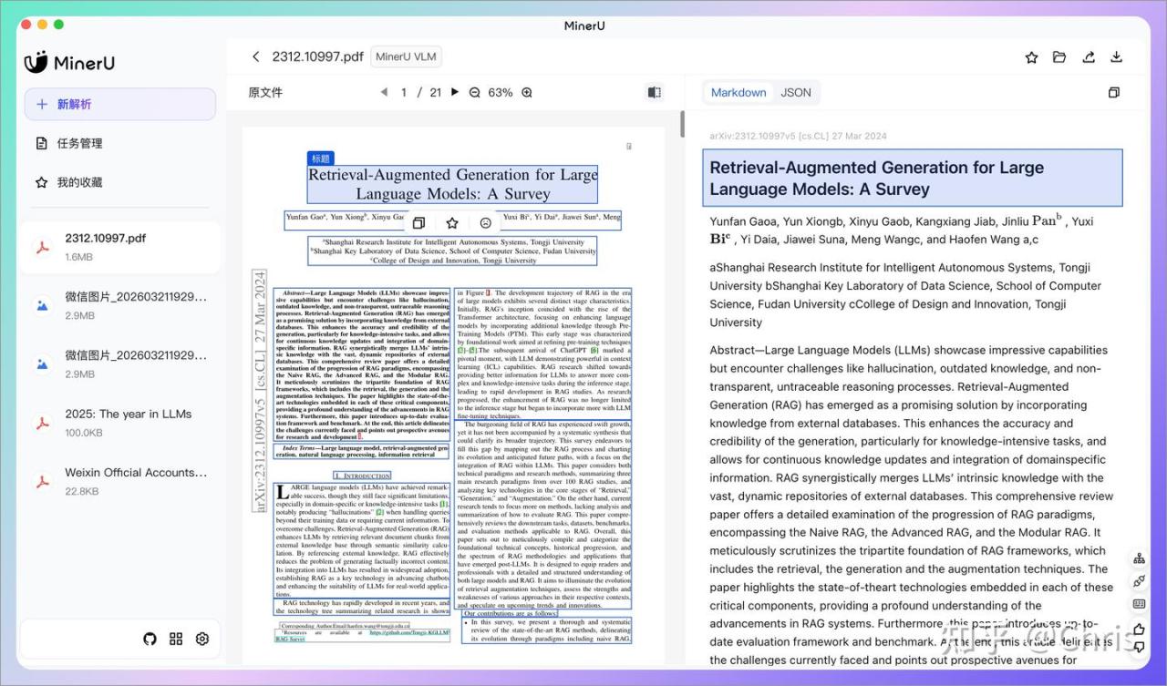 MinerU 支持 PDF、Word、PPT、图片、甚至网页 URL,输出格式是 Markdown 或 JSON。不仅是提取文字,还能”理解”文档的排版结构,哪个是标题、正文、表格、公式,都分得清清楚楚。