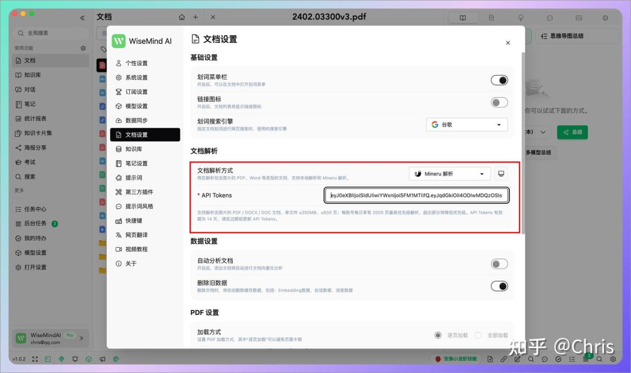 首先你可以到 MinerU – 高质量 PDF 文档解析与转换工具 创建一个免费的 API Token,然后在 WiseMindAI 的“文档设置”中,选择文档解析方式为“MinerU 解析”,然后输入这个 API Token 即可。