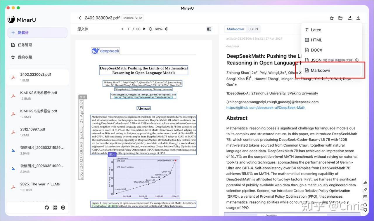输出格式支持 Markdown、JSON、LaTeX,可以直接用在 RAG 和知识库构建里。