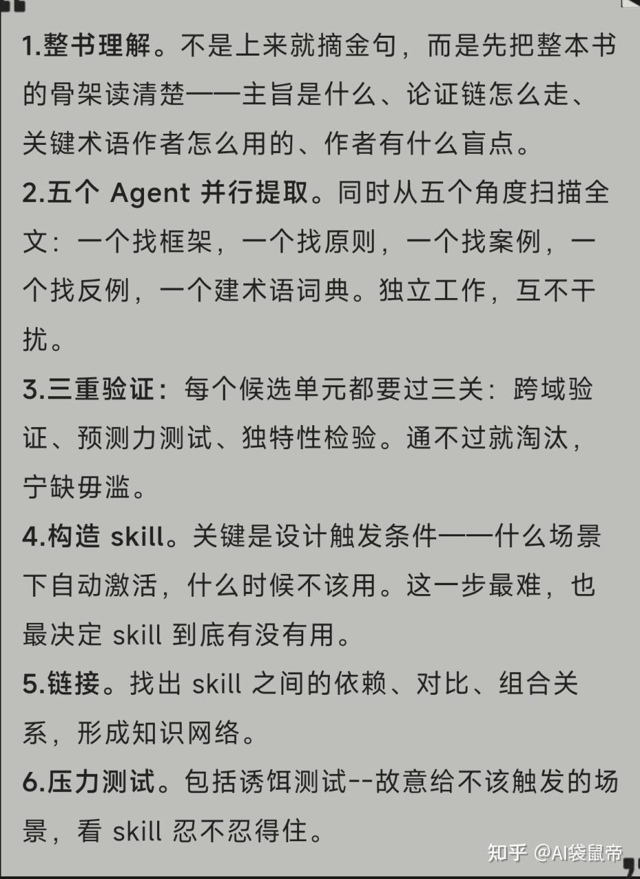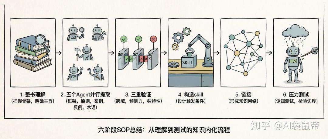 整书理解、五个Agent并行提取、三重验证筛选、skill构造、关系链接、压力测试。